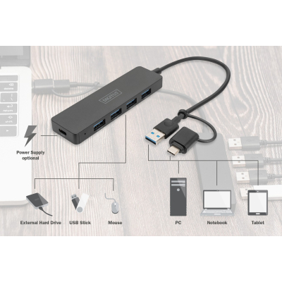 Концентратор Digitus USB-C + USB-A to 4xUSB-A 0.2m black (DA-70235)