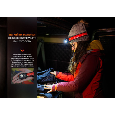 Габарити корпусу становлять 64 x 48 x 27 мм, а вага — лише 97.2 г разом з батареями та кріпленням. Налобне кріплення з регульованою резинкою легко адаптується під розмір голови користувача, а додаткові світловідбиваючі елементи на оголов'ї підвищують вашу видимість у темряві.