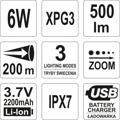 Тип - ручной, источник света - XPG3 CREE 6 Вт, дальность светового потока - 200 м, аккумулятор, яркость - 500 лм, элементы питания - 18650, Li-Ion, вес - 110 г